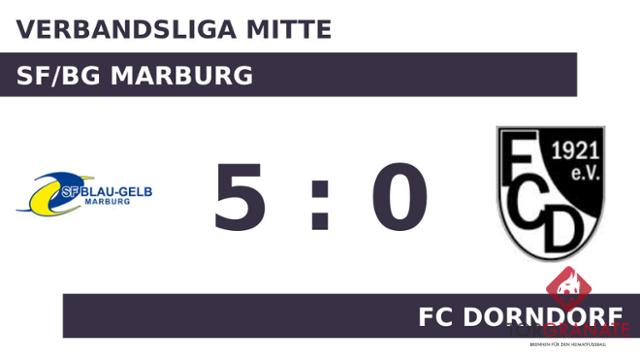 Ein Doppelpack brachte das SF/BG Marburg in eine komfortable Position: Sascha Huhn war gleich zweimal zur Stelle (3./18.). Mit dem 3:0 durch Matthias Weißkopf schien die Partie bereits in der 36. Minute mit den Sportfreunde Blau-Gelb einen sicheren Sieger zu haben. Die Marburger gaben in Durchgang eins klar den Ton an. Folgerichtig stand zur Pause eine klare Führung auf dem Zettel. Die Blau-Gelben bauten die Führung aus, indem Huhn zwei Treffer nachlegte (75./88.). In der 82. Minute stellte der FC Dorndorf personell um: Per Doppelwechsel kamen Colin Iwan und Maximilian Vogt auf den Platz und ersetzten Marcel Jede und Dennis Besirovic. Canice Uhl (Kassel) pfiff schließlich das Spiel ab, in dem das SF/BG Marburg bereits in Durchgang eins deutlich gezeigt hatte, dass es nach 90 Minuten nur einen Sieger geben würde.