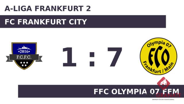Das erste Tor des Spiels ging an den FC Frankfurt City. Allerdings gelang dies nur mithilfe des FFC Olympia 07 Ffm: 1:0 für den FC Frankfurt City durch ein Eigentor in der 27. Minute. Mit einem schnellen Doppelpack (31./32.) zum 2:1 schockte Malte Gaensslen den FC Frankfurt City und drehte das Spiel. Zur Pause behielt der FFC Olympia 07 Ffm die Nase knapp vorn. Der Gast baute den Vorsprung mit der Hilfe des Gegners weiter aus: 3:1 für den FFC Olympia 07 Ffm durch ein Eigentor des FC Frankfurt City in der 55. Minute. Das 4:1 für den FFC Olympia 07 Ffm stellte Gaensslen sicher. In der 67. Minute traf er zum dritten Mal während der Partie. Der FFC Olympia 07 Ffm baute die Führung aus, indem Marco Matschewski zwei Treffer nachlegte (88./89.). Der FFC Olympia 07 Ffm überrannte den FC Frankfurt City förmlich mit sieben Toren und fährt so mit einem verdienten Sieg in der Tasche nach Hause.