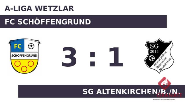 Für das 1:0 und 2:0 war Philipp Heise verantwortlich. Der Akteur traf gleich zweimal ins Schwarze (5./31.). Mit der Führung für den FC Schöffengrund ging es in die Kabine. Durch einen von Marvin Daniel verwandelten Elfmeter gelang der SG Altenkirchen/B./N. in der 53. Minute der 1:2-Anschlusstreffer. Dennis Schmidbauer erhöhte den Vorsprung des FC Schöffengrund nach 63 Minuten auf 3:1. Letztlich nahm das Altenk./Bonb./Neuk. im Kellerduell bei den Gastgebern eine bittere Niederlage hin und unterlag mit 3:1.