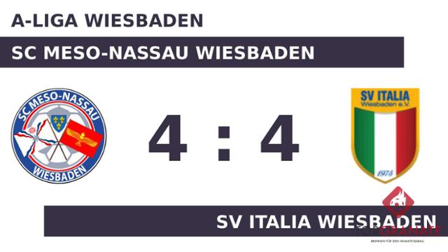 Das erste Tor des Spiels ging an den SV Italia Wiesbaden. Allerdings gelang dies nur mithilfe des SC Meso-Nassau: 1:0 für den SV Italia Wiesbaden durch ein Eigentor in der 28. Minute. Gabriel Kontar beförderte das Leder zum 1:1 des SC Meso-Nassau Wiesbaden in die Maschen (35.). Während einige mit ihren Gedanken bereits in der Pause waren, nutzte Can Hulusi Safak seine Chance und schoss das 2:1 (44.) für den SV Italia Wiesbaden. Geschockt zeigte sich der SC Meso-Nassau nicht. Nur wenig später war Kontar mit dem Ausgleich zur Stelle (45.). Zum Seitenwechsel hatte keine Mannschaft die Oberhand gewonnen. Unentschieden lautete der Zwischenstand. In der 58. Minute erzielte Habib Tolga Can das 3:2 für den SV Italia Wiesbaden. Der SC Meso-Nassau Wiesbaden zeigte sich unbeeindruckt und so drehten Kontar (63.) und Abod Barsom (85.) mit ihren Treffern das Spiel. Kurz vor dem Ende des Spiels jubelte Can mit seinen Teamkollegen über seinen Treffer in der 90. Minute, der einen Gleichstand herbeiführte. Am Ende stand es zwischen dem SC Meso-Nassau und dem SV Italia Wiesbaden pari.