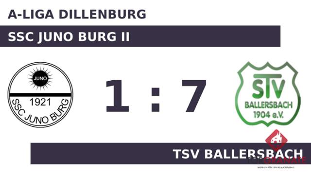 Kurz nach Spielbeginn schockte Philipp Rothe den SSC Juno Burg II und traf für den TSV Ballersbach im Doppelpack (3./5.). Eray Goerguelue traf zum 1:2 zugunsten des SSC Juno Burg II (10.). Spielstark zeigte sich der TSV Ballersbach, als Rothe (18.) und David Niklass (23.) innerhalb weniger Minuten für die Vorentscheidung sorgten. Der SSC Juno Burg II rettete sich mit einem deutlichen Rückstand in die Halbzeitpause. Für die Heimmannschaft war es ein Tag zum Vergessen. Tim Junker (60.), Noah Levi (82.) und Rothe (87.) machten das Unheil perfekt. Mit dem Schlusspfiff durch Referee Mario Becker (Haiger) fuhr der TSV Ballersbach einen Kantersieg ein, der sich schon vor der Halbzeitpause abgezeichnet hatte.