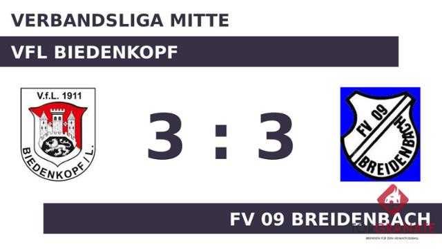 Der VfL Biedenkopf ging mit einem Elfmeter von Dennis Rakowski in Führung (3.). Felix Baum schoss für den FV 09 Breidenbach in der elften Minute das erste Tor. Das letzte Tor der turbulenten Startphase markierte Alexander Mamro in der 19. Minute. Zum Abpfiff der ersten Halbzeit hatte der FV 09 Breidenbach einen knappen Vorsprung herausgespielt. Der Treffer, der Baum in der 90. Minute gelang, bescherte seiner Mannschaft kurz vor dem Ende noch den Ausgleich. In der 90. Minute erzielte Johannes Damm das 3:2 für den VfL Biedenkopf. Jan Niklas Runzheimer war es, der in der 90. Minute das Spielgerät im Tor des FV 09 Breidenbach unterbrachte. Am Ende stand ein Teilerfolg für beide Mannschaften. Der VfL Biedenkopf und der FV 09 Breidenbach spielten unentschieden.