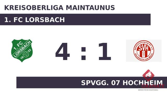 Patrick Rujak brachte den Gastgeber in der zwölften Minute nach vorn. Der 1. FC Lorsbach führte zur Halbzeit knapp mit einem Tor Vorsprung. In der Pause stellte die Spvgg. 07 Hochheim personell um: Per Doppelwechsel kamen Lars Müller und Cenk Celikkol auf den Platz und ersetzten Dramani Adams und Valentin Schrod. In der 58. Minute erhöhte Domenico Brancato auf 2:0 für den 1. FC Lorsbach. Für das 3:0 des 1. FC Lorsbach sorgte Tomislav Grubisic, der in Minute 62 zur Stelle war. Die Spvgg. 07 Hochheim kam kurz vor dem Ende durch Max Möhn zum Ehrentreffer (90.). Nico Lindner vollendete zum vierten Tagestreffer in der 90. Spielminute. Ein starker Auftritt ermöglichte dem 1. FC Lorsbach am Sonntag einen ungefährdeten Erfolg gegen die Spvgg. 07 Hochheim.