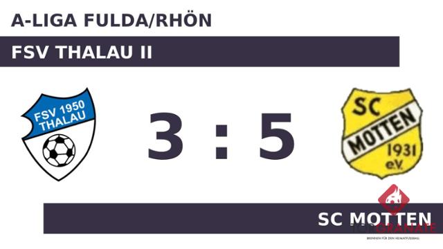 Der SC erwischte einen Blitzstart ins Spiel. Manuel Bug traf in der dritten Minute zur frühen Führung. Das 1:1 des FSV Thalau II bejubelte Lukas Mohr (19.). Der Treffer zum 2:1 sicherte dem SC Motten nicht nur die Führung – es war auch bereits der zweite von Bug in diesem Spiel (20.). Lukas Leibold beförderte das Leder zum 3:1 der Mottener über die Linie (26.). Es folgte der Anschlusstreffer für den FSV Thalau II – bereits der zweite für Mohr. Nun stand es nur noch 2:3 (35.). Kurz vor dem Pausenpfiff erhöhte Julius Mott den Vorsprung des SC Motten auf 4:2 (41.). In Durchgang zwei lief Matthias Görlich anstelle von Mohr für den FSV Thalau II auf. Der Schiedsrichter schickte schließlich beide Mannschaften ohne weitere Änderung am Spielstand in die Kabinen. Bug brachte den SC Motten in ruhiges Fahrwasser, indem er das 5:2 erzielte (58.). In der 61. Minute brachte Lukas Schenkel das Netz für den FSV Thalau II zum Zappeln. Der FSV tauschte zwei etatmäßige Verteidiger: Reiner Scholz ersetzte Fabian Kress (74.). Die 3:5-Heimniederlage der Thalauer war Realität, als Referee Mischa Ristic (Fulda) die Partie letztendlich abpfiff.