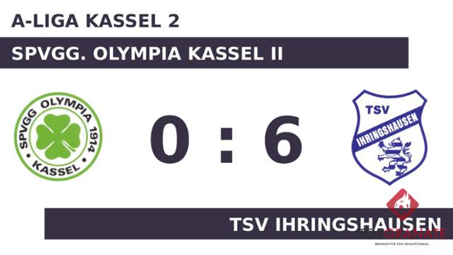Die Spvgg. Olympia Kassel II geriet schon in der vierten Minute in Rückstand, als Hendrik Hussmann das schnelle 1:0 für den TSV Ihringshausen erzielte. In der 36. Minute erhöhte Ferris Sonnenschein auf 2:0 für den TSV Ihringshausen. In der 43. Minute verwandelte Tim Brödner einen Elfmeter zum 3:0 für die Gäste. Das überzeugende Auftreten des TSV Ihringshausen fand Ausdruck in einer klaren Halbzeitführung. Max Messerschmidt überwand den gegnerischen Schlussmann zum 4:0 für den TSV Ihringshausen (51.). Der TSV Ihringshausen baute die Führung aus, indem Chris Mucha zwei Treffer nachlegte (68./70.). Am Ende fuhr der TSV Ihringshausen einen deutlichen Sieg ein. Dabei demonstrierte der TSV Ihringshausen bereits in Hälfte eins großes Leistungsvermögen, als man Olympia Kassel II in Grund und Boden spielte.