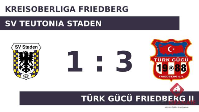 Alessandro Cavalera brachte das TG Friedberg II in der zwölften Minute nach vorn. Kurz vor dem Pfiff zur Halbzeit machte Fynn Jannik Stürtz das 1:1 zugunsten des SV Teutonia Staden (43.). Zur Halbzeit war die Partie noch vollkommen offen. Remis lautete das Zwischenresultat. Zakaria Akaouch machte in der 87. Minute das 2:1 des Türk Gücü Friedberg II perfekt. Ehe der Abpfiff ertönte, war es Benjamin Shakoory, der das 3:1 aus Sicht des Gasts perfekt machte (89.). Mit Ablauf der Spielzeit schlug das TG Friedberg II den SV Teutonia Staden 3:1.
