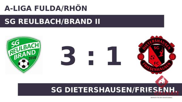 Fabian Link brachte das Heimteam in der elften Minute in Front. Reulbach/Brand II hatte zur Pause eine knappe Führung auf dem Zettel stehen. Wenig später verwandelte Tizian Handwerk einen Elfmeter zum 2:0 zugunsten der SG Reulbach/Brand II (51.). Simon Wehner brachte Reulbach/Brand II in ruhiges Fahrwasser, indem er das 3:0 erzielte (73.). Die SG Dietershausen/Friesenh. verkürzte den Rückstand in der 87. Minute durch einen Elfmeter von Patrik Reinhardt auf 1:3. Zum Schluss feierte die SG Reulbach/Brand II einen dreifachen Punktgewinn gegen die Gäste.