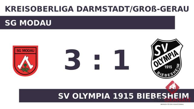Die SG Modau erwischte einen Blitzstart ins Spiel. Daniel Bulert traf in der dritten Minute zur frühen Führung. Die SG Modau machte weiter Druck und erhöhte den Spielstand im Eilschritt durch einen Treffer von Vasco Barreto Marques (7.). Für Gianfranco Stallone war der Einsatz nach 14 Minuten vorbei. Für ihn wurde Patrik Schmitt eingewechselt. In der 37. Minute brachte Robin Frisch den Ball im Netz der SG Modau unter. Mit einem Tor Vorsprung für die SG Modau ging es für die beiden Teams in die Halbzeitpause. Ehe der Abpfiff ertönte, war es Timo Mertz, der das 3:1 aus Sicht der SG Modau perfekt machte (90.). Am Schluss gewann die SG Modau gegen das Olympia Biebesheim.