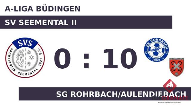 Kaum war das Spiel angepfiffen, lag die SG Rohrbach/Aulendiebach bereits in Front. Finn Schaefer markierte in der dritten Minute die Führung. Bereits in der zwölften Minute erhöhte Kevin Scheller den Vorsprung der Rohrbach/Aulendieb. In der 20. Minute legte Jamal Graulich zum 3:0 zugunsten der SG Rohrbach/Aulendiebach nach. Scheller gelang ein Doppelpack (34./35.), mit dem er das Ergebnis auf 5:0 hochschraubte. Schaefer (39.) und Graulich (43.) brachten die Rohrbach/Aulendieb. mit zwei schnellen Treffern weiter nach vorne. SV Seemental II gelang in der ersten Halbzeit gar nichts, sodass man zur Pause weit hinter der SG Rohrbach/Aulendiebach zurück lag. Für das 8:0 und 9:0 war Scheller verantwortlich. Der Akteur traf gleich zweimal ins Schwarze (53./88.). Schaefer stellte wenige Minuten vor dem Schlusspfiff den Stand von 10:0 für die Rohrbach/Aulendieb. her (90.). Schließlich war auch der Torrausch der SG Rohrbach/Aulendiebach vorbei und SV Seemental II in Einzelteile zerlegt.
