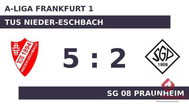 Für das erste Tor sorgte Jannik Lobenstein. In der zwölften Minute traf der Spieler des TuS Nieder-Eschbach ins Schwarze. Abdessamaa Semmatou Badi musste nach nur 20 Minuten vom Platz, für ihn spielte Alexendre Mbonigaba weiter. Jannik Uusneem nutzte die Chance für SG 08 Praunheim und beförderte in der 32. Minute das Leder zum 1:1 ins Netz. In Durchgang zwei lief Baran Yilmaz anstelle von Mert Kirci für den Gast auf. Weitere Tore blieben bis zum Pfiff des Schiedsrichters aus. Somit ging es mit einem unveränderten Stand in die Halbzeitpause. Lamine Nesta Kaiser stellte die Weichen für den TuS Nieder-Eschbach auf Sieg, als er in Minute 53 mit dem 2:1 zur Stelle war. Die nächsten beiden Treffer waren einem Mann vorbehalten: Mbonigaba schnürte einen Doppelpack (58./70.), sodass das Heimteam fortan mit 4:1 führte. Fabian Bohn überwand den gegnerischen Schlussmann zum 5:1 für den TuS Nieder-Eschbach (72.). Für das 2:5 von SG Praunheim zeichnete Uusneem verantwortlich (75.). Mit dem Schlusspfiff durch den Unparteiischen Maik Abyaneh (Frankfurt am Main) siegte der TuS Nieder-Eschbach gegen SG 08 Praunheim.