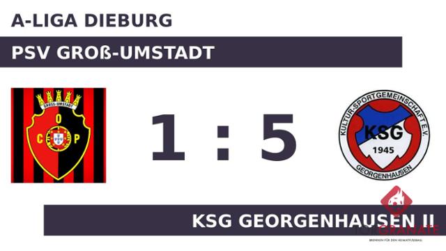 Die erste Halbzeit endete ohne ein zählbares Ereignis für beide Mannschaften. Nicolaus Weiler brach für die KSG Georgenhausen II den Bann und markierte in der 65. Minute die Führung. Mund abputzen und weitermachen: Unter diesem Motto stand der Ausgleich, den Gazi Mohammad bereits wenig später besorgte (70.). Mit einem schnellen Doppelpack (75./80.) zum 3:1 schockte Leon Rudolph den PSV Groß-Umstadt. Der vierte Streich der KSG Georgenhausen II war Christian Palzer vorbehalten (87.). Ehe der Abpfiff ertönte, war es Rudolph, der das 5:1 aus Sicht des Gasts perfekt machte (89.). Letztlich hat der PSV Groß-Umstadt den Befreiungsschlag klar verpasst. Gegen den direkten Widersacher um den Klassenverbleib, das Schlusslicht, bekam man das Fell über die Ohren gezogen.