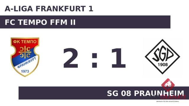 Für den Führungstreffer der Gastgeber zeichnete Zeljko Fastikic verantwortlich (27.). Zum psychologisch wichtigen Zeitpunkt kurz vor der Halbzeit (45.) traf Timo Enders zum Ausgleich für SG Praunheim. Eine Aussage darüber, wer am Ende die Nase vorn haben würde, war nach dem Abpfiff der ersten Halbzeit noch nicht zu treffen. Es ging mit einem Gleichstand in die Kabinen. Dank eines Treffers von Djordje Kovacic in der Schlussphase (90.) gelang es dem FC Tempo Ffm II, die Führung einzufahren. Letzten Endes holte der FC Tempo Ffm II gegen SG 08 Praunheim drei Zähler.