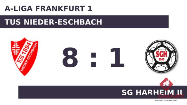 Der TuS Nieder-Eschbach erwischte einen Blitzstart ins Spiel. Menno Jeroen de Jong traf in der sechsten Minute zur frühen Führung. Bereits in der 15. Minute erhöhte Jan Moy den Vorsprung des TuS Nieder-Eschbach. Nach nur 25 Minuten verließ Alexendre Mbonigaba vom TuS Nieder-Eschbach das Feld, Lo Pes Luis Miguel kam in die Partie. Nicklas Brenden witterte seine Chance und schoss den Ball zum 1:2 für die Zweitvertretung von SG Harheim ein (28.). Die Vorentscheidung führten k. A. (33.) und Fabian Bohn (40.) mit zwei Toren innerhalb weniger Minuten herbei. Das überzeugende Auftreten des TuS Nieder-Eschbach fand Ausdruck in einer klaren Halbzeitführung. In der Pause stellte SG Harheim II personell um: Per Doppelwechsel kamen David Dulc und Yafet Tsighe auf den Platz und ersetzten Miquel Angelo Lacerda und Eike Otten. Der TuS Nieder-Eschbach konnte mit dem ersten Durchgang sehr zufrieden sein. Trotzdem gab es Veränderungen beim TuS Nieder-Eschbach. Julian Gebken ersetzte Marcel Codjo Noubouke, der nun schon vorzeitig Feierabend machte. Für endgültig klare Verhältnisse sorgten die Treffer von Benjamin Wotzka (53.), Moy (60.) und Oliver Drisch (88.). Durch ein Eigentor von SG Harheim II verbesserte der TuS Nieder-Eschbach den Spielstand auf 8:1 für sich (90.). Mit dem Schlusspfiff durch den Unparteiischen Andreas Steffen Doil (Frankfurt am Main) fuhr der TuS Nieder-Eschbach einen Kantersieg ein, der sich schon vor der Halbzeitpause abgezeichnet hatte.