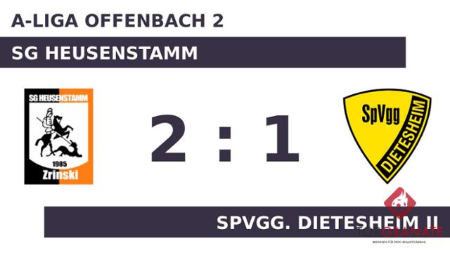 Vitomir Ser brachte die SG Heusenstamm in der 39. Spielminute in Führung. Zur Pause war die SG Heusenstamm im Fahrwasser und verbuchte eine knappe Führung. Bei der SG Heusenstamm kam zu Beginn der zweiten Hälfte Eldin Zenunovic für Franjo Radman in die Partie. Argun Tugtekin schoss für die Spvgg. Dietesheim II in der 68. Minute das erste Tor. Zwei Minuten später ging die SG Heusenstamm durch den zweiten Treffer von Ser in Führung. Zum Schluss feierte die SG Heusenstamm einen dreifachen Punktgewinn gegen die Spvgg. Dietesheim II.