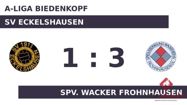 Der SV Eckelshausen geriet schon in der neunten Minute in Rückstand, als Jan Niklas Heck das schnelle 1:0 für die Spv. Wacker Frohnhausen erzielte. Zum psychologisch ungünstigen Zeitpunkt vor der Halbzeit (45.) schoss Micha Koch einen weiteren Treffer für die Spv. Frohnhausen. Es waren die Gäste, die zur Pause eine Führung ihr Eigen nannten. Christian Immel legte in der 64. Minute zum 3:0 für die Spv. Wacker Frohnhausen nach. Der SV Eckelshausen verkürzte den Rückstand in der 78. Minute durch einen Elfmeter von Sebastian Vendel auf 1:3. Am Ende verbuchte die Spv. Frohnhausen gegen den Gastgeber die maximale Punkteausbeute.