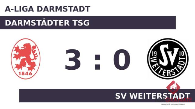 Für das erste Tor sorgte Hamza Madroun. In der 17. Minute traf der Spieler der Darmstädter TSG ins Schwarze. Die Pausenführung der Heimmannschaft fiel knapp aus. Zum Seitenwechsel ersetzte Samet Soylu vom SV Weiterstadt seinen Teamkameraden Fabio Trenado Cincotti. Paul Pinker machte in der 61. Minute das 2:0 der Darmstädter TSG perfekt. Simon Christian Kallfaß legte in der 68. Minute zum 3:0 für die Darmstädter TSG nach. Am Schluss schlug die Darmstädter TSG den SV Weiterstadt mit 3:0.