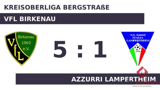 Auf die vermeintliche Siegerstraße brachte Nunzio Pelleriti sein Team in der 29. Minute. Azzurri hatte zur Pause eine knappe Führung auf dem Zettel stehen. Wenig später verwandelte Florian Frölich einen Elfmeter zum 1:1 zugunsten des VfL Birkenau (54.). Wichai Schäfer stellte die Weichen für die Heimmannschaft auf Sieg, als er in Minute 56 mit dem 2:1 zur Stelle war. Andre Halblaub beseitigte mit seinen Toren (75./85.) die letzten Zweifel am Sieg des VfL Birkenau. Nico Pfahl besorgte in der Schlussphase schließlich den fünften Treffer für den VfL Birkenau (90.). Am Ende kam der VfL Birkenau gegen Azzurri Lampertheim zu einem verdienten Sieg.