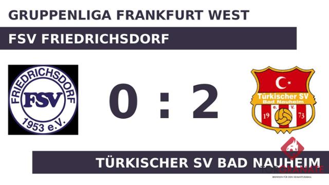 Im ersten Durchgang tasteten sich die beiden Mannschaften lediglich ab, Tore gab es nicht zu verzeichnen. Der Türkischer SV Bad Nauheim wechselte für den zweiten Durchgang: Tolga Yilmaz spielte für Abdul Baki Özisli weiter. Die Offensive des TSV sollte der eingewechselte Tufan Tosunoglu (für Leutrim Jusufi) ankurbeln (64.). Kurz vor dem Ende des Spiels nahm der FSV Friedrichsdorf noch einen Doppelwechsel vor, sodass David Mueller und Mike Horn für Benjamin Celikci und Robin Pflüger weiterspielten (85.). Luis Raúl Vazquez Kundel schoss in der 89. Minute vom Elfmeterpunkt das erste Tor des Spiels für den TSV Bad Nauheim. Tosunoglu stellte wenige Minuten vor dem Schlusspfiff den Stand von 2:0 für die Türken her (90.). Zum Schluss feierte der Türkischer SV Bad Nauheim einen dreifachen Punktgewinn gegen den FSV Friedrichsdorf.