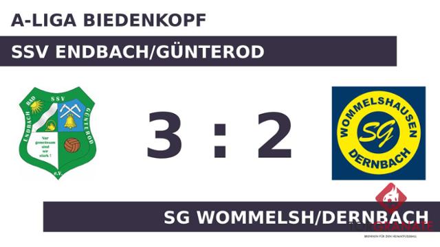 Der Gast geriet schon in der siebten Minute in Rückstand, als Nils Ellenfeld das schnelle 1:0 für den SSV Endbach/Günterod erzielte. In der 15. Minute erzielte Youssef Es Saidi das 1:1 für die SG Wommelsh/Dernbach. Rico Seidel brachte dem Wommelsh/Dernbach nach 39 Minuten die 2:1-Führung. Die SG Wommelsh/Dernbach nahm die knappe Führung mit in die Kabine. Nach der Pause ging das Spiel ohne Ellenfeld weiter, dafür stand nun Elias Bothe beim SSV Endbach/Günterod auf dem Feld. Kevin Krenn war es, der in der 55. Minute das Spielgerät im Tor des Wommelsh/Dernbach unterbrachte. Zum spielentscheidenden Akteur avancierte Tino Schoener, der mit seinem Treffer in der 87. Minute die späte Führung des SSV Endbach/Günterod sicherstellte. Als der Unparteiische Julian Simon (Bad Endbach) die Begegnung beim Stand von 3:2 letztlich abpfiff, hatte die Heimmannschaft die drei Zähler unter Dach und Fach.