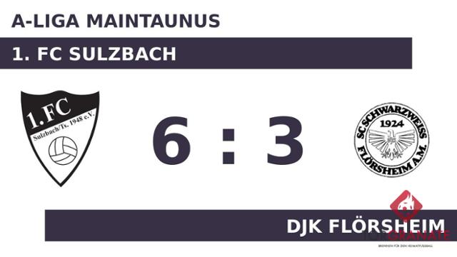 Kaum war das Spiel angepfiffen, lagen die Flörsheimer bereits in Front. Altan Demirarslan markierte in der fünften Minute die Führung. Lange währte die Freude des SC Schwarz-Weiß nicht, denn schon in der achten Minute schoss Mijo Tovilo den Ausgleichstreffer für den 1. FC Sulzbach. Eren Bahcetepe brachte der DJK Flörsheim nach 28 Minuten die 2:1-Führung. Die Gäste zeigten plötzlich einen Leistungseinbruch, den der 1. FC Sulzbach eiskalt ausnutzte. Adis Pita (33./44.) und Oliver Knatz (37.) brachten in dieser Phase dreimal den Ball im gegnerischen Tor unter und drehten die Partie auf 4:2. Mit der Führung für den 1. FC Sulzbach ging es in die Kabine. Valentin Savov (48.) und Pita (53.) trafen innerhalb weniger Minuten zur Vorentscheidung des Gastgebers. Kurz vor Ultimo war noch Oktay Demirarslan zur Stelle und zeichnete für das dritte Tor der DJK Flörsheim verantwortlich (87.). Schlussendlich verbuchte der 1. FC Sulzbach gegen die DJK Flörsheim einen überzeugenden Heimerfolg.