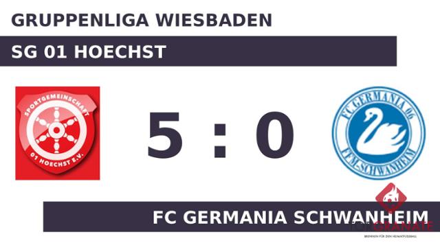 Der FC Germania Schwanheim geriet schon in der zehnten Minute in Rückstand, als Sven Patzwald das schnelle 1:0 für die SG 01 Hoechst erzielte. Firat Tayboga erhöhte den Vorsprung der SG 01 Hoechst nach 21 Minuten auf 2:0. Mit dem 3:0 durch David Rodriguez schien die Partie bereits in der 23. Minute mit der SG 01 Hoechst einen sicheren Sieger zu haben. Die Überlegenheit der SG 01 Hoechst spiegelte sich in einer deutlichen Halbzeitführung wider. Das 4:0 für die SG 01 Hoechst stellte Rodriguez sicher. In der 46. Minute traf er zum zweiten Mal während der Partie. Ab der 52. Minute bereicherte der für Justin Matthews eingewechselte Ahmet Gök die SG 01 Hoechst im Vorwärtsgang. Mit dem Tor zum 5:0 steuerte Tayboga bereits seinen zweiten Treffer an diesem Tag bei (78.). Alina Lange (Darmstadt) pfiff schließlich das Spiel ab, in dem die SG 01 Hoechst bereits in Durchgang eins deutlich gezeigt hatte, dass es nach 90 Minuten nur einen Sieger geben würde.