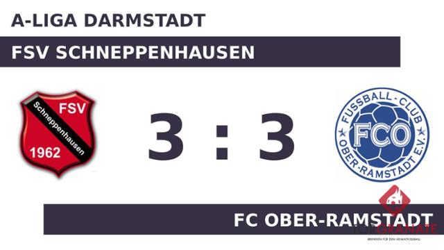 Der FSV Schneppenhausen erwischte einen Blitzstart ins Spiel. Mulualem Tilahun Haile traf in der ersten Minute zur frühen Führung. Für Anas Akhouaji war der Einsatz nach einer Minute vorbei. Für ihn wurde Mouhieddine Hamma eingewechselt. Lange währte die Freude des FSV Schneppenhausen nicht, denn schon in der vierten Minute schoss Ahmet Caglar den Ausgleichstreffer für den FC Ober-Ramstadt. Der Treffer zum 2:1 sicherte dem FSV Schneppenhausen nicht nur die Führung – es war auch bereits der zweite von Haile in diesem Spiel (6.). Sinan Ceylan versenkte den Ball in der 17. Minute im Netz des Heimteams. Das letzte Tor der turbulenten Startphase markierte Özer Kaygusuz in der 27. Minute. Weitere Tore blieben bis zum Pfiff des Schiedsrichters aus. Somit ging es mit einem unveränderten Stand in die Halbzeitpause. Das 3:3 des FSV Schneppenhausen stellte Haile sicher (73.). Bis zum Abpfiff setzte sich keines der beiden Teams durch und so trennten sich der FSV Schneppenhausen und der FC Ober-Ramstadt mit einem Unentschieden.