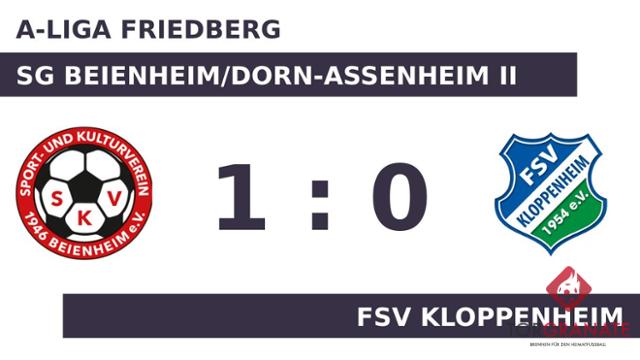 Eine Aussage darüber, wer am Ende die Nase vorn haben würde, war nach dem Abpfiff der ersten Halbzeit noch nicht zu treffen. Es ging mit einem Gleichstand in die Kabinen. Mit einem Wechsel – Marco Hofmann kam für Brenden Hare – startete der SG Beienheim/Dorn-Assenheim II in Durchgang zwei. Christopher Ess brach für den Gastgeber den Bann und markierte in der 78. Minute die Führung. Am Ende machte ein Tor den Unterschied zwischen dem Beienh./Dorn-Ass. II und dem FSV Kloppenheim aus.