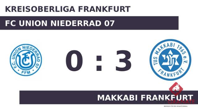 Younes Fennach trug sich in der 14. Spielminute in die Torschützenliste ein. Der FC Union Niederrad glich bis zum Halbzeitpfiff nicht mehr aus. Schließlich schickte der Unparteiische Birani Achraf (Frankfurt am Main) beide Teams mit der knappen Führung für das Makkabi Frankfurt in die Kabinen. Hamza Chouiba erhöhte den Vorsprung des Makkabi Frankfurt nach 57 Minuten auf 2:0. Aziz Derrou besorgte in der Schlussphase schließlich den dritten Treffer für das Makkabi Frankfurt (75.). Mit dem Ende der Spielzeit strich das Makkabi Frankfurt gegen den FC Union Niederrad 07 die volle Ausbeute ein.