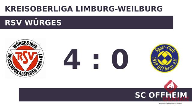 Ivan Biskoc trug sich in der 19. Spielminute in die Torschützenliste ein. Ein Tor mehr für den RSV Würges machte den Unterschied zur Pause zwischen den beiden Mannschaften aus. Der SC Offheim wechselte für den zweiten Durchgang: Thomas Koch spielte für Kevin Jung weiter. In der Pause stellte der RSV Würges personell um: Per Doppelwechsel kamen Lars Klippel und Emre Can auf den Platz und ersetzten Jermaine Pedraza und Miguel Granja. In der 48. Minute erhöhte Youness Lmadaghri auf 2:0 für die Heimmannschaft. Alen Nukovic gelang ein Doppelpack (55./74.), mit dem er das Ergebnis auf 4:0 hochschraubte. Letztlich feierte der RSV Würges gegen den SC Offheim nach einer überzeugenden Darbietung einen verdienten 4:0-Heimsieg.