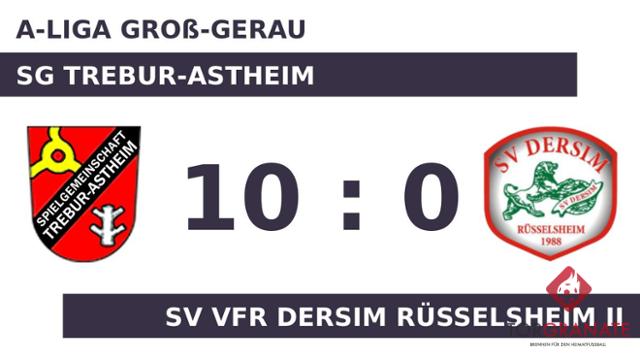 Die nächsten beiden Treffer waren einem Mann vorbehalten: Elias Achilles schnürte einen Doppelpack (17./36.), sodass die SG Trebur-Astheim fortan mit 3:0 führte. Adrian Khang Muders brachte die SG Trebur-Astheim in der 17. Spielminute in Führung. Nach dem souveränen Auftreten der SG Trebur-Astheim überraschte es kaum einen Zuschauer, dass zur Pause eine deutliche Führung stand. Die SG Trebur-Astheim baute die Führung aus, indem Yannik Fuchs zwei Treffer nachlegte (54./63.). In Topform präsentierte sich Achilles, der einen lupenreinen Hattrick markierte (66./71./72.) und dem SV VFR Dersim Rüsselsheim II einen schweren Schlag versetzte. Der neunte Streich der SG Trebur-Astheim war Justin Auth vorbehalten (75.). Andre Muders besorgte in der Schlussphase schließlich den zehnten Treffer für die SG Trebur-Astheim (90.). Am Ende ließ die SG Trebur-Astheim kein gutes Haar an Dersim Rüsselsh. II und siegte außerordentlich hoch.