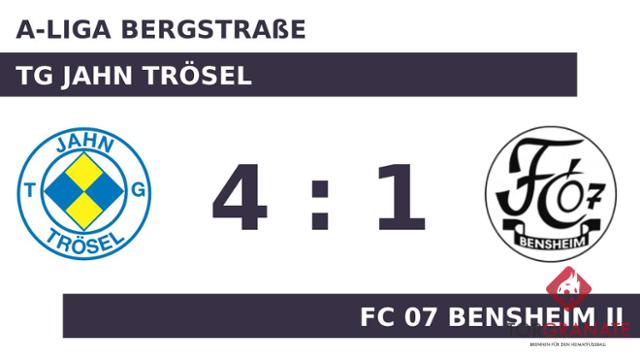 Die TG Jahn Trösel ging durch Dominik Arnold in der 26. Minute in Führung. Mit einem Tor Vorsprung für den Gastgeber ging es für die beiden Teams nach dem Pausenpfiff in die Kabinen. In der 47. Minute erhöhte Jonas Schröter auf 2:0 für die TG Jahn Trösel. Für das 3:0 der TG Jahn Trösel sorgte Maurice Engert, der in Minute 71 zur Stelle war. In der Schlussphase gelang Ehsan Arfai noch der Ehrentreffer für den FC 07 Bensheim II (85.). Arnold überwand den gegnerischen Schlussmann zum 4:0 für die TG Jahn Trösel (85.). Ein starker Auftritt ermöglichte der TG Jahn Trösel am Sonntag einen ungefährdeten Erfolg gegen den FC 07 Bensheim II.