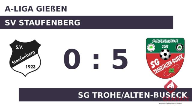 Kaum war das Spiel angepfiffen, lagen die Gäste bereits in Front. Nicolas Dieter Hahn markierte in der fünften Minute die Führung. Bereits in der 14. Minute erhöhte Vedat Kocas den Vorsprung der Trohe/Alten-Buseck. Mit dem 3:0 durch Benedikt Wagenlehner schien die Partie bereits in der 32. Minute mit der SG Trohe/Alten-Buseck einen sicheren Sieger zu haben. Der Halbzeitpfiff war noch nicht ertönt, als Kocas seinen zweiten Treffer nachlegte (41.). Der tonangebende Stil der Trohe/Alten-Buseck spiegelte sich in einer klaren Pausenführung wider. Eigentlich war der SV Staufenberg schon geschlagen, als Jascha Magiera das Leder zum 0:5 über die Linie beförderte (48.). In der 58. Minute stellte die SG Trohe/Alten-Buseck personell um: Per Doppelwechsel kamen Fritz Birnstiel und Lukas Ihm auf den Platz und ersetzten Wagenlehner und Magiera. Mit dem Schlusspfiff durch den Unparteiischen Uwe Lang (Gladenbach) fuhr die Trohe/Alten-Buseck einen Kantersieg ein, der sich schon vor der Halbzeitpause abgezeichnet hatte.