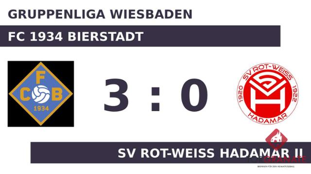 Der Unparteiische setzte mit dem Halbzeitpfiff dem torlosen Treiben auf dem Feld vorläufig ein Ende. Der FC 1934 Bierstadt ging durch Fabian Paradies in der 55. Minute in Führung. In der 77. Minute erhöhte Tobias Beck auf 2:0 für das Heimteam. In der 83. Minute stellte der FC 1934 Bierstadt personell um: Per Doppelwechsel kamen Andreas Freimann und Lucas Keutmann auf den Platz und ersetzten Marco Carrera und Kenzo Kramer. Niklas Kern stellte schließlich in der 90. Minute den 3:0-Sieg für den FC 1934 Bierstadt sicher. Letztlich nahm das Rot-Weiss Hadamar II im Kellerduell beim FC 1934 Bierstadt eine bittere Niederlage hin.