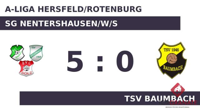 Pascal Mangold brachte die SG Nentershausen/W/S in der 24. Minute in Front. Nach nur 24 Minuten verließ Levi-Jonas Peters vom TSV Baumbach das Feld, Carlos Schaefer kam in die Partie. Als manch einer bereits mit den Gedanken in der Halbzeitpause war, besorgte Elias Nölke auf Seiten der SG NWS das 2:0 (40.). Mit der Führung für die SG ging es in die Kabine. Zum Seitenwechsel ersetzte Christian Ehrhard vom TSV Baumbach seinen Teamkameraden Dominik Salzmann. Tim Bachmann gelang ein Doppelpack (59./62.), mit dem er das Ergebnis auf 4:0 hochschraubte. Den Vorsprung der SG Nentershausen/W/S ließ Darius Oster in der 74. Minute anwachsen. Kurz vor dem Ende des Spiels nahm die Spielgemeinschaft noch einen Doppelwechsel vor, sodass Johannes Claus und Sebastian Pitsch für Oster und Rico Muhlack weiterspielten (85.). Letztlich kam die SG NWS gegen den TSV Baumbach zu einem verdienten 5:0-Sieg.