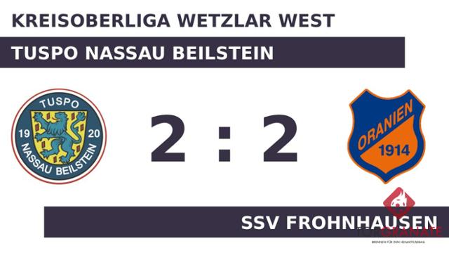 Der SSV Frohnhausen geriet schon in der zehnten Minute in Rückstand, als Hifzi Ulusoy das schnelle 1:0 für den TuSpo Beilstein erzielte. Tom Rossmann nutzte die Chance für den SSV Frohnhausen und beförderte in der 17. Minute das Leder zum 1:1 ins Netz. Jannik Schubert musste nach nur 17 Minuten vom Platz, für ihn spielte Kevin Immel weiter. Ohne dass sich am Stand noch etwas geändert hatte, verabschiedeten sich beide Mannschaften zur Pause in die Kabinen. David Alexander Tabachnyk, der von der Bank für Jan Niklas Hardt kam, sollte für neue Impulse beim SSV Frohnhausen sorgen (73.). Dass der Gast in der Schlussphase auf den Sieg hoffte, war das Verdienst von Tabachnyk, der in der 80. Minute zur Stelle war. Der Treffer, der Aron Müller in der 90. Minute gelang, bescherte seiner Mannschaft kurz vor dem Ende noch den Ausgleich. Schließlich gingen der TuSpo Nassau Beilstein und der SSV Frohnhausen mit einer Punkteteilung auseinander.