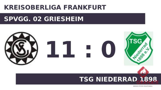 In Topform präsentierte sich Deniz Pekgüzelyigit, der einen lupenreinen Hattrick markierte (4./7./18.) und der TSG Niederrad 1898 einen schweren Schlag versetzte. Durch Treffer von Clinton Adjei Asante (22.), Enver Kelmendi (40.), Tcha Djobo Fayisal (43.) und Pekgüzelyigit (45.) zog die Spvgg. 02 Griesheim uneinholbar davon. Die TSG Niederrad 1898 sah in Durchgang eins kein Land und lag zur Pause unaufholbar zurück. Dem 8:0 durch Angelo Castrovillari (48.) ließen Pekgüzelyigit (53.), Fayisal (57.) und Isaac Ameyaw (78.) weitere Treffer für die Spvgg. 02 Griesheim folgen. Schließlich war auch der Torrausch der Spielvereinigung vorbei und die TSG Niederrad 1898 in Einzelteile zerlegt.