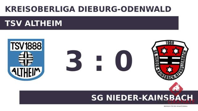 Die SG Nieder-Kainsbach geriet schon in der zehnten Minute in Rückstand, als Pasquale Lauria das schnelle 1:0 für den TSV Altheim erzielte. Für das 2:0 des TSV Altheim zeichnete Diyar Altan verantwortlich (34.). Mit der Führung für den Gastgeber ging es in die Kabine. Hendrik Makolli brachte den TSV Altheim in ruhiges Fahrwasser, indem er das 3:0 erzielte (56.). In der 69. Minute stellte der TSV Altheim personell um: Per Doppelwechsel kamen Seriba Diarra und Daniel Lauckhardt auf den Platz und ersetzten Ricardo Hieronymus und Marcel Komma. Letzten Endes schlug der TSV Altheim im 22. Saisonspiel die SG Nieder-Kainsbach souverän mit 3:0 vor heimischer Kulisse.