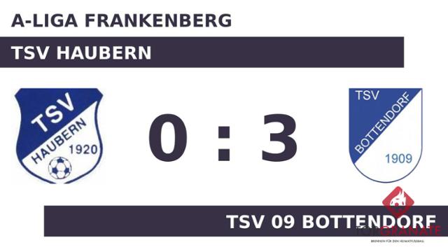 Die erste Halbzeit endete ohne ein zählbares Ereignis für beide Mannschaften. Lukas Mienik trug sich in der 50. Spielminute in die Torschützenliste ein. In der 52. Minute erhöhte Andres Tissen auf 2:0 für den TSV Bottendorf. In der 62. Minute verwandelte Nils Feyerabend einen Elfmeter zum 3:0 für den TSV 09 Bottendorf. Harry Lopez-Arcos (Lichtenfels) beendete das Spiel und damit schlug der TSV Bottendorf den TSV Haubern auswärts mit 3:0.
