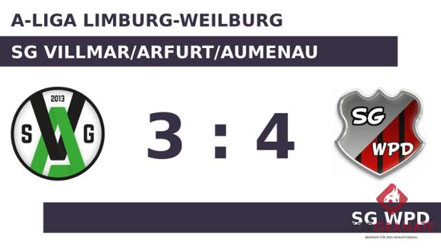 Das Villmar/Arfurt/Aum. legte los wie die Feuerwehr und ließ durch einen Doppelschlag von Patrick Zanner aufhorchen (10./11.). Das letzte Tor der turbulenten Startphase markierte Leon Scherer in der 14. Minute. In der Zeit bis zur Pause fiel kein weiteres Tor, es blieb bei der Führung für die SG Villmar/Arfurt/Aumenau. Mit einem schnellen Doppelpack (56./59.) zum 3:2 schockte Melvin Schlicht das Heimteam und drehte das Spiel. Rafael Busch erhöhte den Vorsprung der SG WPD nach 77 Minuten auf 4:2. Es folgte der Anschlusstreffer für das Villmar/Arfurt/Aum. – bereits der dritte für Zanner. Nun stand es nur noch 3:4 (90.). Letzten Endes holte die SG WPD gegen die SG Villmar/Arfurt/Aumenau drei Zähler.
