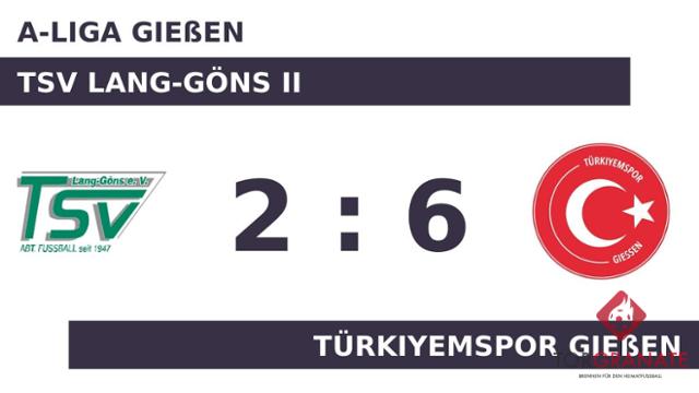 Für das 1:0 und 2:0 war Barbaros Koyuncu verantwortlich. Der Akteur traf gleich zweimal ins Schwarze (19./27.). In der 43. Minute stellte der TSV Lang-Göns II personell um: Per Doppelwechsel kamen Erik Janzen und Furkan Sahin auf den Platz und ersetzten Ali Ahmad Taheri und Levent Aytemiz. Wenige Momente vor dem Seitenwechsel war Christian Schaefer mit dem 1:2 für den Gastgeber zur Stelle (44.). Das Türkiyemspor Gießen führte zur Halbzeit knapp mit einem Tor Vorsprung. Maximilian Mueller ließ sich in der 62. Minute nicht zweimal bitten und verwertete zum 2:2 für den TSV Lang-Göns II. Mit schnellen Toren von Guerkan Genc (66.) und Osman Koyuncu (72.) schlug das Türkiyemspor Gießen innerhalb kurzer Zeit gleich doppelt zu. Barbaros Koyuncu gelang ein Doppelpack (81./88.), mit dem er das Ergebnis auf 6:2 hochschraubte. Ein starker Auftritt ermöglichte dem Türkiyemspor Gießen am Sonntag einen ungefährdeten Erfolg gegen den TSV Lang-Göns II.