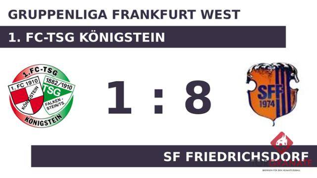 Kaum war das Spiel angepfiffen, lag der Spitzenreiter bereits in Front. Joschua Lyzcarz markierte in der dritten Minute die Führung. Haris Jakubovic beförderte das Leder zum 2:0 des Gasts über die Linie (22.). Turgay Akbulut gelang ein Doppelpack (25./28.), mit dem er das Ergebnis auf 4:0 hochschraubte. Kurz vor dem Pausenpfiff erhöhte Davor Babic den Vorsprung von SF Friedrichsdorf auf 5:0 (42.). In der ersten Hälfte lieferte der 1. FC-TSG Königstein eine desaströse Leistung ab, sodass man auf einen erdrückenden Rückstand blickte, als der Schiedsrichter diese beendete. SF Friedrichsdorf tauschte zwei etatmäßige Verteidiger: Gabriel Fustero ersetzte Babic (62.). In der 66. Minute wechselte SF Friedrichsdorf Ted Eric Mbenoun für Anthony Wade ein, einen nominellen Verteidiger für einen anderen. Akbulut schraubte das Ergebnis in der 68. Minute mit dem 6:0 für SF Friedrichsdorf in die Höhe. Krish Raweri erzielte in der 71. Minute den Ehrentreffer für den 1. FC-TSG Königstein. Wenig später kamen Okan Koyun und Christopher Skoczny per Doppelwechsel für Jakubovic und Akbulut auf Seiten von SF Friedrichsdorf ins Match (71.). Mit zwei schnellen Treffern von Jonatan Tesfaldet (80.) und Masih Saighani (87.) machte SF Friedrichsdorf deutlich, dass mit diesem Angriff jederzeit zu rechnen ist. Der Unparteiische pfiff schließlich das Spiel ab, in dem SF Friedrichsdorf bereits in Durchgang eins deutlich gezeigt hatte, dass es nach 90 Minuten nur einen Sieger geben würde.