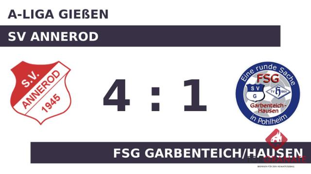 Ausgerechnet zum psychologisch ungünstigen Zeitpunkt vor der Halbzeit traf Lucas Smajek für den SV Annerod zur Führung (44.). Die Heimmannschaft nahm die knappe Führung mit in die Kabine. Valdrin Hadri erhöhte den Vorsprung des SV Annerod nach 80 Minuten auf 2:0. Florian Pinkl ließ sich in der 86. Minute nicht zweimal bitten und verwertete zum 1:2 für die FSG Garbenteich/Hausen. Maurizio Berti beförderte das Leder zum 3:1 des SV Annerod über die Linie (87.). Für das 4:1 zugunsten des SV Annerod sorgte dann kurz vor Schluss Maximilian Fett, der den SV Annerod und die Fans von einer Spitzenplatzierung träumen ließ (90.). Am Schluss siegte der SV Annerod gegen die Garbenteich/Hausen.