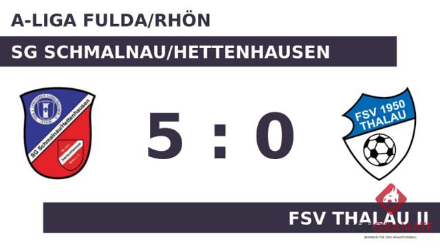 Nach nur 25 Minuten verließ Tihomir Dokic von Schmaln./Hettenh. das Feld, Marius Bub kam in die Partie. Cornelius Schleicher trug sich in der 29. Spielminute in die Torschützenliste ein. Um die drohende Niederlage abzuwenden, kam mit Marvin Zednik ein zusätzlicher nomineller Angreifer für den FSV Thalau II in die Partie (37). Der Treffer von Marko Novakovic ließ nach 39 Minuten die 150 Zuschauer neuerlich jubeln und vergrößerte den Vorsprung der SG Schmalnau/Hettenhausen. Mit der Führung für den Spitzenreiter ging es in die Kabine. Ab der 70. Minute bereicherte der für Novakovic eingewechselte Fabian Barth die Gastgeber im Vorwärtsgang. Für das 3:0 von Schmaln./Hettenh. sorgte Jure-Ivan Madzar, der in Minute 72 zur Stelle war. Jonas Will vollendete zum vierten Tagestreffer in der 80. Spielminute. Tobias Bub gelang in den Schlussminuten noch ein weiterer Treffer für die SG Schmalnau/Hettenhausen (84.). Letztlich kam Schmaln./Hettenh. gegen den FSV Thalau II zu einem verdienten 5:0-Sieg.