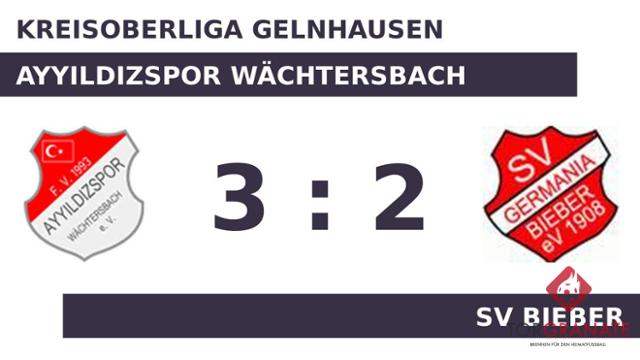 Das erste Tor des Spiels ging an den SV Bieber. Allerdings gelang dies nur mithilfe des Ayy. Wächtersbach: 1:0 für den SV Bieber durch ein Eigentor in der 13. Minute. Tarik Özyer war es, der in der 24. Minute das Spielgerät im Gehäuse des SV Bieber unterbrachte. Haris Dudevic verwandelte in der 45. Minute einen Elfmeter und brachte dem SVB die 2:1-Führung. Die Germania nahm die knappe Führung mit in die Kabine. Kasim Basaram ließ sich in der 66. Minute nicht zweimal bitten und verwertete zum 2:2 für das Ayyildizspor Wächtersbach. Die Türken gingen durch einen Elfmeter von Dimitrij Scheller in Führung (78.). Am Schluss siegte das Ayy. Wächtersbach gegen den SV Bieber.