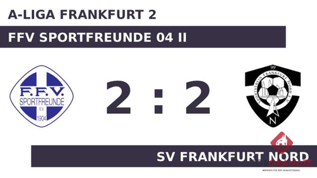 Für Faton Toski war der Einsatz nach acht Minuten vorbei. Für ihn wurde Goekhan Temur eingewechselt. Der Unparteiische setzte mit dem Halbzeitpfiff dem torlosen Treiben auf dem Feld vorläufig ein Ende. Mit einem Wechsel – Anas Massi kam für Imad Akhouaji – startete SV Frankfurt Nord in Durchgang zwei. Anstelle von Ismail Yilmaz war nach Wiederbeginn Abdullah Elbay für den FFV Sportfreunde 04 II im Spiel. Ahmet Oezer war es, der in der 53. Minute das Spielgerät im Tor von SV Frankfurt Nord unterbrachte. Advan Cakiqi traf zum 1:1 zugunsten des Gasts (65.). Dass der FFV Sportfreunde II in der Schlussphase auf den Sieg hoffte, war das Verdienst von Hakim Hagelmüller, der in der 73. Minute zur Stelle war. Der Gastgeber musste den Treffer von Temur zum 2:2 hinnehmen (83.). Mit dem Abpfiff des Unparteiischen trennten sich der FFV Sportfreunde 04 II und SV Frankfurt Nord remis.