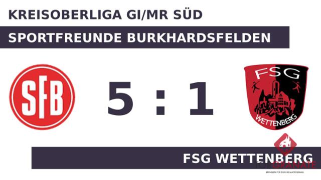 Das erste Tor des Spiels ging an die SF Burkhardsfelden. Allerdings gelang dies nur mithilfe der FSG Wettenberg: 1:0 für die Sportfreunde Burkhardsfelden durch ein Eigentor in der 15. Minute. Marian Hild erhöhte den Vorsprung der SF Burkhardsfelden nach 23 Minuten auf 2:0. Justin Raith schraubte das Ergebnis in der 35. Minute mit dem 3:0 für das Heimteam in die Höhe. Zur Halbzeit blickte die Sportfreunde Burkhardsfelden auf einen klaren Vorsprung gegen einen Gegner, den man deutlich beherrschte. Hild gelang ein Doppelpack (59./62.), mit dem er das Ergebnis auf 5:0 hochschraubte. In der Schlussphase gelang Florian Valentin noch der Ehrentreffer für die FSG Wettenberg (82.). Letztlich feierte die SF Burkhardsfelden gegen die Gäste nach einer überzeugenden Darbietung einen verdienten Heimsieg.