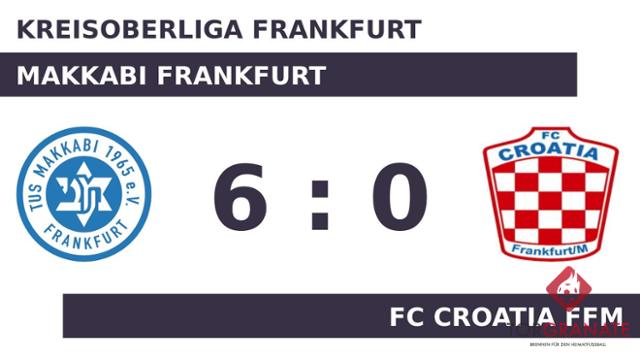 Der FC Croatia Ffm geriet schon in der achten Minute in Rückstand, als Robel Seiverth-Tsegai das schnelle 1:0 für das Makkabi Frankfurt erzielte. Aziz Derrou erhöhte den Vorsprung des Makkabi Frankfurt nach 32 Minuten auf 2:0. Mit der Führung für das Makkabi Frankfurt ging es in die Kabine. Beim FC Croatia Ffm kam zu Beginn der zweiten Hälfte Miro Novokmet für Ivan Propadalo in die Partie. Derrou gelang ein Doppelpack (74./80.), mit dem er das Ergebnis auf 4:0 hochschraubte. In der 83. Minute legte Leon Suhr zum 5:0 zugunsten des Makkabi Frankfurt nach. Younes Fennach war es, der kurz vor Ultimo das 6:0 besorgte und das Makkabi Frankfurt inklusive Anhang damit von höheren Gefilden träumen lässt (86.). Am Ende kam das Makkabi Frankfurt gegen den FC Croatia Ffm zu einem verdienten Sieg.