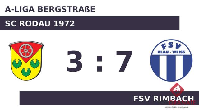 Gianluca Mueller ließ sich in der 13. Minute nicht zweimal bitten und verwertete zum 1:0 für die Gäste. Salman Ahmad sicherte dem SC Rodau 1972 nach 16 Minuten den Ausgleich durch einen Elfmeter. Für das zweite Tor des Gastgebers war Florian Mitsch verantwortlich, der in der 23. Minute das 2:1 besorgte. Nach nur 23 Minuten verließ Okan Ceneli von FSV Rimbach das Feld, Jonas Olejniczak kam in die Partie. Das letzte Tor der turbulenten Startphase markierte Daniel Steinke in der 26. Minute. Der Schiedsrichter schickte schließlich beide Mannschaften ohne weitere Änderung am Spielstand in die Kabinen. Mit zwei schnellen Treffern von Patrick Feller (52.) und Amir Duric (56.) machte FSV Rimbach deutlich, dass mit diesem Angriff jederzeit zu rechnen ist. Mit einem schnellen Hattrick (63./66./73.) zum 6:3 schockte Feller den SC Rodau 1972. In der 83. Minute stellte FSV Rimbach personell um: Per Doppelwechsel kamen Oliver Rettig und Marcus Schwarz auf den Platz und ersetzten Benjamin Ahmetovic und Felix Plücker. Mueller baute den Vorsprung von FSV Rimbach in der 87. Minute aus. Der SC Rodau 1972 ließ nach dem Wiederanpfiff stark nach und bot FSV Rimbach nicht mehr Paroli, sodass das Polster der ersten Halbzeit nicht einmal für ein Unentschieden reichte.