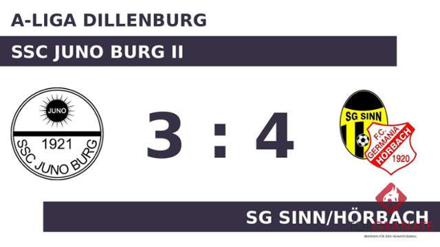 Die SG Sinn/Hörbach erwischte einen Blitzstart ins Spiel. Patrick Stremmel traf in der sechsten Minute zur frühen Führung. In der 13. Minute brachte Eray Goerguelue den Ball im Netz des Gasts unter. Tim Hoerl witterte seine Chance und schoss den Ball zum 2:1 für die SG Sinn/Hörbach ein (39.). Kurz vor dem Pausenpfiff erhöhte Jan Luca Jung den Vorsprung der SG Sinn/Hörbach auf 3:1 (41.). Es waren die Gäste, die zur Pause eine Führung ihr Eigen nannten. Salvatore Spera ließ sich in der 51. Minute nicht zweimal bitten und verwertete zum 2:3 für den SSC Juno Burg II. In der 61. Minute gelang dem Heimteam, was zur Pause in weiter Ferne war: der Ausgleichstreffer durch Jonas Hofmann. Zum spielentscheidenden Akteur avancierte Moritz Mueller, der mit seinem Treffer in der 90. Minute die späte Führung der SG Sinn/Hörbach sicherstellte. Schließlich strich die SG Sinn/Hörbach die Optimalausbeute gegen den SSC Juno Burg II ein.