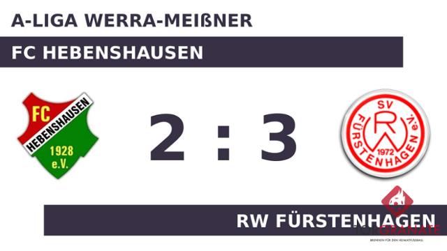 Kaum war das Spiel angepfiffen, lagen die Gäste bereits in Front. Niclas Theil markierte in der dritten Minute die Führung. Mark Schalansky war es, der in der 15. Minute das Spielgerät im Tor von RW Fürstenhagen unterbrachte. Justin Weyenberg brachte Hebenshausen nach 33 Minuten die 2:1-Führung. Die Führung hielt allerdings nur zwei Minuten. Ein Eigentor brachte den Ausgleich für RW Fürstenhagen (35.). Zur Halbzeit war die Partie noch vollkommen offen. Remis lautete das Zwischenresultat. Marius Theil versenkte die Kugel zum 3:2 (61.). In den 90 Minuten war RW Fürstenhagen im gegnerischen Strafraum erfolgreicher als der FC Hebenshausen und fuhr somit einen 3:2-Sieg ein.